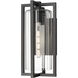 Clean lines intersect, offering a multi-plane dimensionality and turning this modern one-light outdoor wall light into a sophisticated way to illuminate a structure or patio space. A Coastal black paint finish inspires elegance matched by ribbed clear glass in a cylinder shade. This fixture is dimmable, delivering varying light levels.